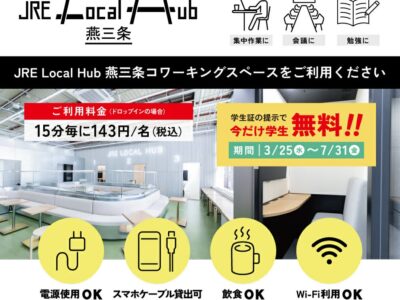 燕三条こうばの窓口は、上越新幹線燕三条駅改札外フロアに所在する地域創生型ワークプレイス「JRE Local Hub 燕三条」の総合窓口です。